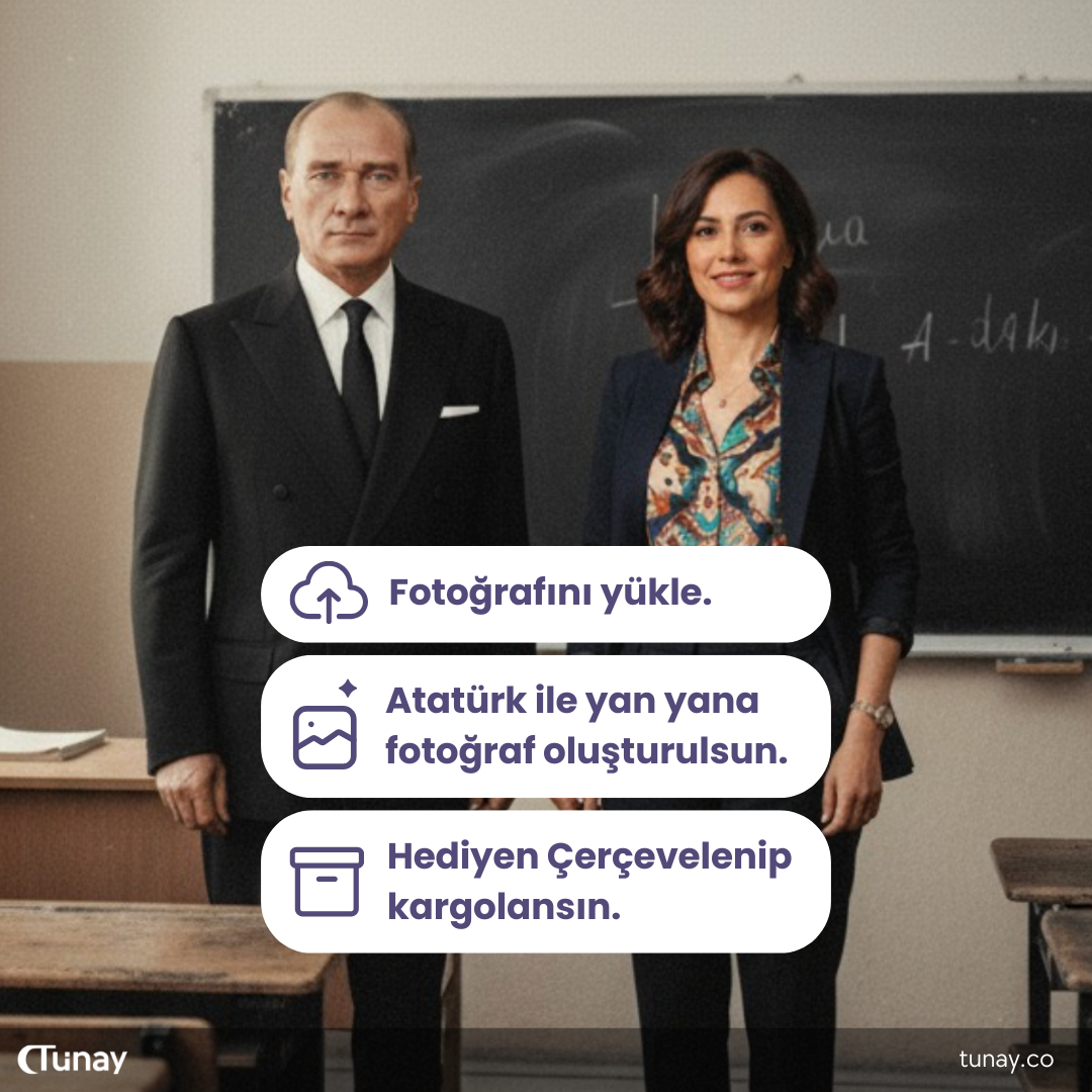 Öğretmeninizin Atatürk ile yan yana yer alacağınız bu özel fotoğraf çerçevesi, ona Atatürk’ün ışığından aldığı ilhamı her an hatırlatacak.