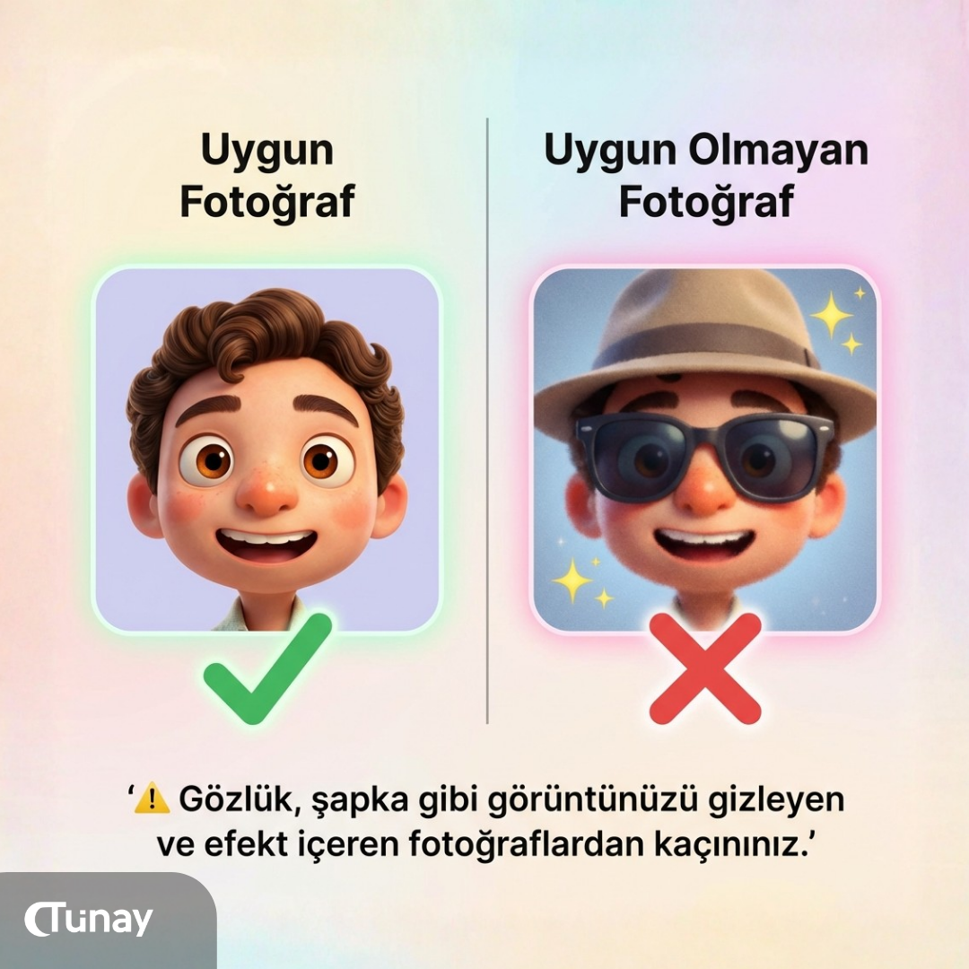 ❗Gözlük, şapka gibi görüntünüzü gizleyen ve efekt içeren fotoğraflardan kaçınınız.
