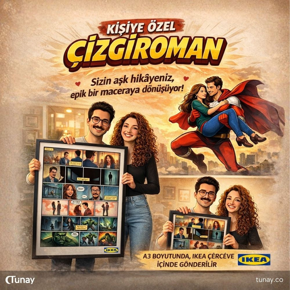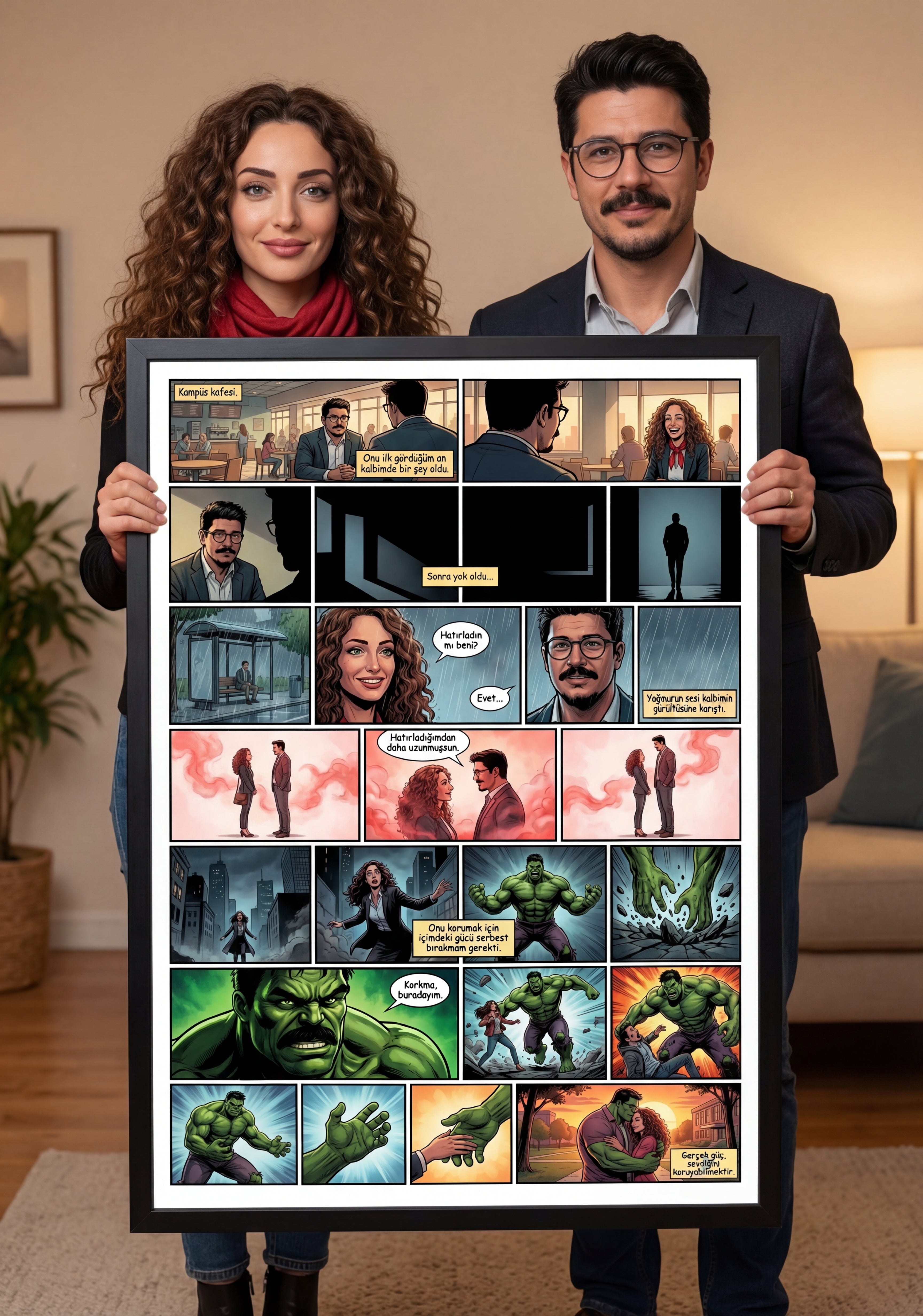 Tanışma hikâyenizi 20–28 panellik, epik bir çizgi roman poster haline getiriyoruz.